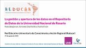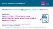 Item type: Ítem , Access status: Acceso Abierto , La gestión y apertura de los datos en el Repositorio de Datos de la Universidad Nacional de Rosario(2024-08-27) Díaz Pacífico, Fernando Gabriel; Bongiovani, Paola Carolina; Freán, PaulinaPresentación sobre la “Gestión de datos de investigación, Proyecto Dataverse” en la primera sesión del “Seminario Permanente de Reflexión y Acción en la Práctica Bibliotecaria” de las Universidades de la Red Educativa Universitaria de Conocimiento y Acción Regional (REDUCAR).Item type: Ítem , Access status: Acceso Abierto , Construyendo puentes globales para facilitar el éxito local de la ciencia abierta y la gestión de datos de investigación(2024-05-16) Hanahoe, Hilary; 0000-0002-0328-3419; Universidad Nacional de Rosario. Comité de Acceso Abierto. Unidad de Gestión de Acceso Abierto; Cuerpo de Traductores UNR. Centro de Estudios InterdisciplinariosHilary Hanahoe, Secretaria General de la Research Data Alliance (RDA), presentó en la Universidad Nacional de Rosario, Argentina,sobre la importancia de construir puentes globales para el éxito local en ciencia abierta y gestión de datos de investigación. La ciencia abierta es un movimiento global con beneficios locales, cuyo objetivo es democratizar el acceso al conocimiento y acelerar el progreso científico. La Gestión de Datos de Investigación (GDI) se refiere a la gestión activa y continua de los datos desde su creación hasta su archivo y divulgación. Video disponible en https://www.youtube.com/live/jMoiY79OyDA?si=It_pJgNOSUiB9CEi La visión de la RDA es fomentar que investigadores compartan y reutilicen datos abiertamente, a través de tecnologías, disciplinas y fronteras. Su misión es construir puentes sociales y técnicos para posibilitar el intercambio y reutilización de datos de manera abierta, bajo principios de apertura, consenso, inclusividad y neutralidad tecnológica. La RDA está compuesta por más de 14,200 personas, 85 organizaciones y representantes de 35 naciones/regiones. Funciona a través de grupos de trabajo que desarrollan herramientas y políticas para la gestión de datos, grupos de interés que resuelven problemas específicos de compartir datos y comunidades de práctica que se enfocan en áreas disciplinares y de concientización. Hilary enfatizó que la RDA fomenta la colaboración global en ciencia abierta y gestión de datos, proporcionando una plataforma para que investigadores y profesionales compartan conocimientos y desarrollen prácticas efectivas para enfrentar desafíos científicos y sociales.Item type: Ítem , Access status: Acceso Abierto , Preparación de videos cortos como material de difusión de Datos de Investigación. Trabajo colaborativo entre investigadores y equipo de comunicación(2024-04-25) Quintana, Dolores; Freán, Paulina; Bongiovani, Paola CarolinaCharla virtual informativa para la elaboración de un pieza gráfica como material de difusión de datos de investigación publicados en el Repositorio de Datos Académicos RDA-UNR. La comunicación efectiva de los datos de investigación es fundamental. La utilización de videos e imágenes en las redes sociales emerge como una estrategia para ampliar el alcance de la investigación y hacer que la información sea accesible y atractiva.Item type: Ítem , Access status: Acceso Abierto , Implementación de Identificadores Persistentes (PIDs) para aumentar el impacto del Repositorio de Datos Académicos RDA-UNR(2023-10-20) Salazar, Analía; Freán, Paulina; Chiappero, Gisela; Quintana, Dolores; Bongiovani, Paola Carolina; Alfieri, AgustínSe presenta la implementación de Identificadores Persistentes (PIDs) en el Repositorio de Datos Académicos RDA-UNR (https://dataverse.unr.edu.ar). Los problemas detectados fueron la necesidad de identificación única de los conjuntos de datos, de los archivos, de los investigadores y de la Universidad para asegurar la correcta atribución de autoría y facilitar la referenciación precisa de los elementos, además de asegurar la integridad y recuperación de los datos, su correcta citación y vinculación con otros recursos académicos. Se examinan específicamente los identificadores ORCID, DOI y ROR, y se evalúa su presencia y utilización en los metadatos de los conjuntos de datos.Item type: Ítem , Access status: Acceso Abierto , El impacto de los Identificadores Persistentes (PIDs) en el Repositorio de Datos Académicos RDA-UNR https://dataverse.unr.edu.ar(2023-10-20) Freán, Paulina; Salazar, Analía; Chiappero, Gisela; Quintana, Dolores; Bongiovani, Paola Carolina; Alfieri, AgustínEl poster presentado aborda la implementación de Identificadores Persistentes (PIDs) en el Repositorio de Datos Académicos RDA-UNR (dataverse.unr.edu.ar). Los problemas detectados fueron la necesidad de identificación única de los conjuntos de datos y archivos, de los investigadores y de la Universidad para asegurar la correcta atribución de autoría y facilitar la referenciación precisa de los elementos, además de asegurar la integridad y recuperación de los datos, su correcta citación y vinculación con otros recursos académicos.Item type: Ítem , Access status: Acceso Abierto , Capacitación. ¿Cómo publicar datos de investigación en el Repositorio de Datos Académicos RDA-UNR?(2023-10-05) Bongiovani, Paola Carolina; Centro de Estudios Fotosintéticos Y Bioquímicos (CEFOBI) y la Biblioteca Central "Dr. Hipólito González" de la Facultad de Ciencias Bioquímicas y FarmacéuticasEn este seminario capacitación sobre curación de datos de investigación organizada por el Centro de Estudios Fotosintéticos Y Bioquímicos (CEFOBI) y la Biblioteca Central "Dr. Hipólito González" de la Facultad de Ciencias Bioquímicas y Farmacéuticas, se presentan aspectos teórico prácticos relativos a la curación y publicación de datos en el Repositorio de Datos Académicos RDA-UNR.Item type: Ítem , Access status: Acceso Abierto , Implementación 