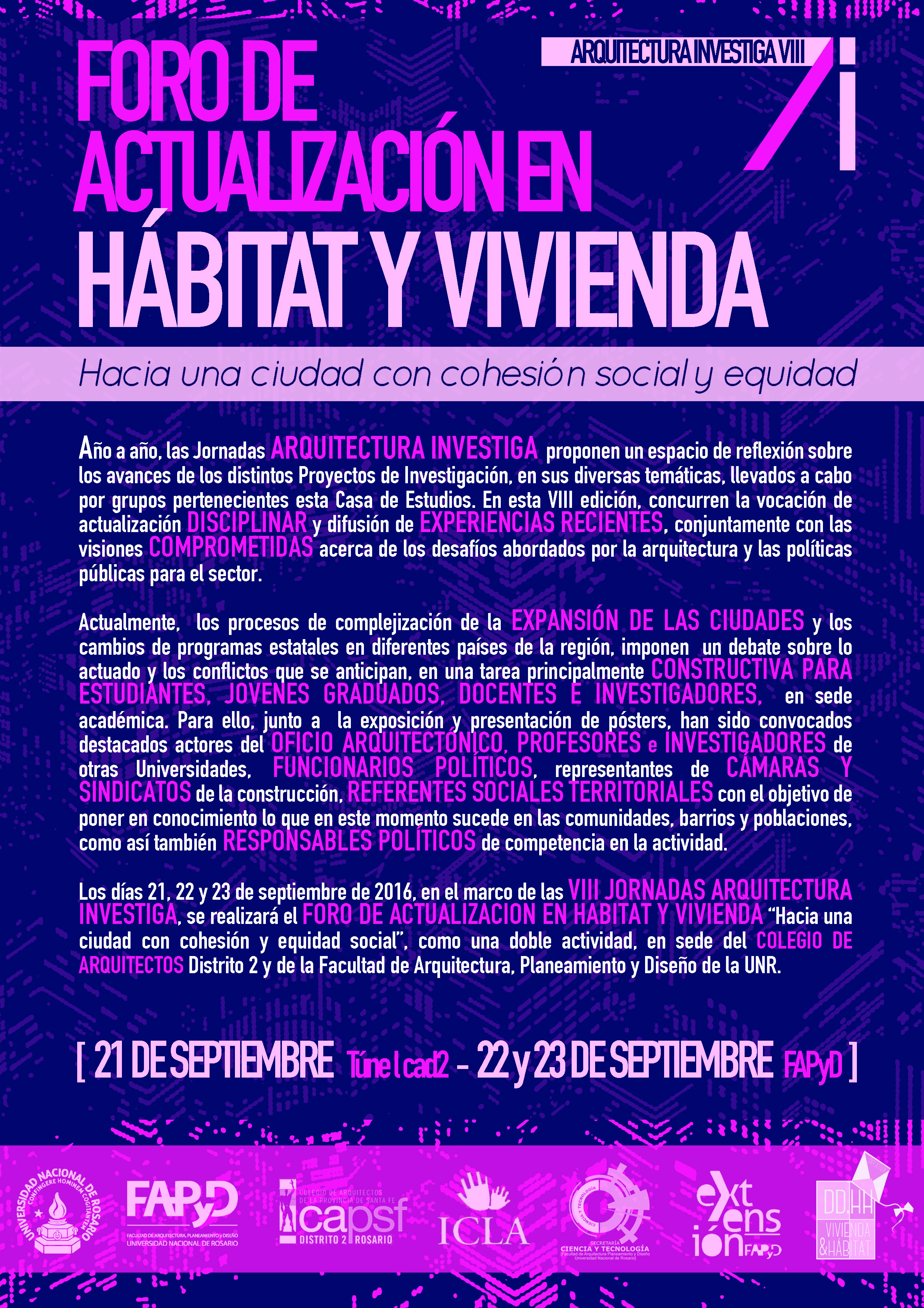 Los días 21, 22 y 23 de septiembre de 2016, en el marco de las VIII JORNADAS ARQUITECTURA INVESTIGA, se realizará el FORO DE ACTUALIZACION EN HABITAT Y VIVIENDA “Hacia una ciudad con cohesión y equidad social”, como una doble actividad, en sede del COLEGIO DE ARQUITECTOS Distrito 2 y de la Facultad de Arquitectura, Planeamiento y Diseño de la UNR.
