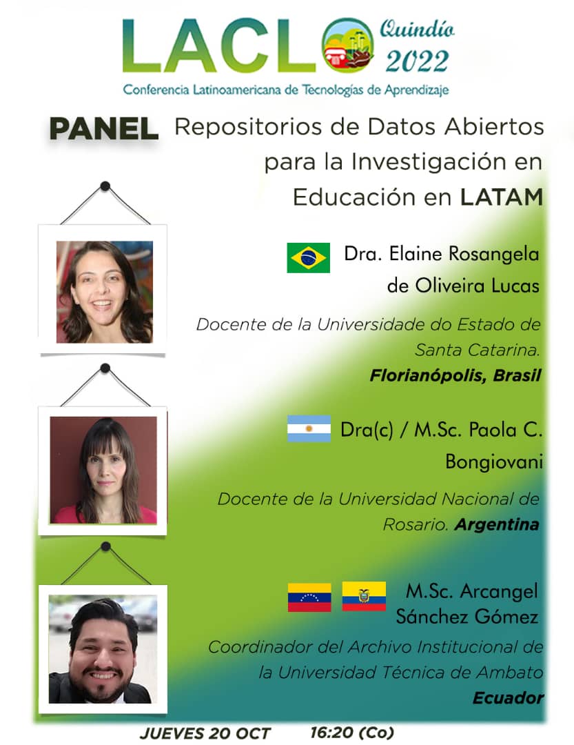 La Conferencia Latinoamericana de Tecnologías de Aprendizaje – LACLO se realiza anualmente desde 2006, mismo año en que se creó la Comunidad Latinoamericana de Objetos de Aprendizaje (LACLO). Ha sido organizado en diferentes países de América Latina, y en el marco de su 17° edición 2022, se realizó el Panel “Repositorio de Datos Abiertos para la Investigación en Educación en LATAM”. Acceder al video de la conferencia: https://uniquindio.webex.com/uniquindio/ldr.php?RCID=a1e2b921c56e6b584ed8e14bb028a79f Password: dDPZxy3V
