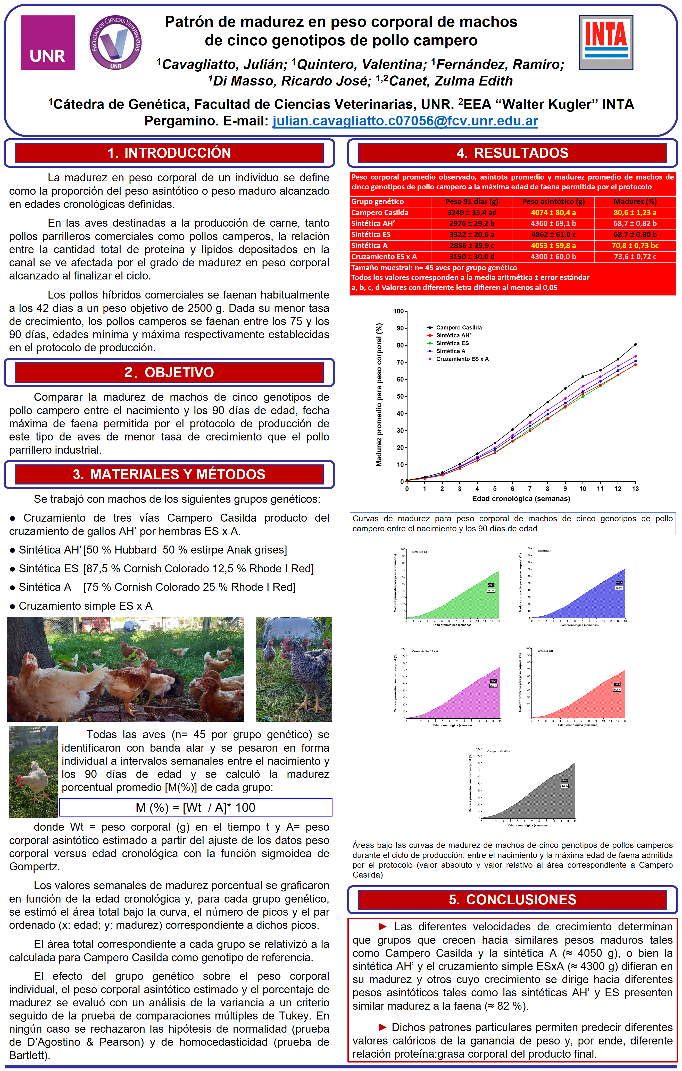 La madurez en peso corporal se define como la proporción del peso asintótico alcanzado en edades cronológicas definidas. En las aves para carne el grado de madurez al finalizar el ciclo afecta la relación proteína:lípidos depositados en la canal. El pollo campero es un ave de menor tasa de crecimiento que el pollo parrillero industrial destinado a sistemas semi- intensivos que preservan el bienestar animal. El objetivo de este trabajo fue comparar la madurez de machos de cinco genotipos de pollo campero entre el nacimiento y los 90 días de edad, fecha máxima de faena permitida por el protocolo de producción. Se calculó la madurez porcentual promedio [M(%)= (Wt/PA)*100, donde Wt es el peso corporal promedio del grupo en la semana t y PA es su peso asintótico teórico promedio estimado con la función de Gompertz], de 45 individuos de cada uno de los siguientes genotipos: cruzamiento de tres vías Campero Casilda[CC: ♂ AH’ x ♀ (ES x A)], las poblaciones sintéticas que le dan origen: AH’, ES y A y el cruzamiento simple ESxA, a intervalos semanales entre el nacimiento y la semana 13. Los respectivos pesos asintóticos (media aritmética ± error estándar, en g): CC- 4074 ± 80,4; AH’ - 4360 ± 69,1; ES - 4862 ± 61,0; A - 4053 ± 59,8 y ESxA - 4300 ± 60,0. Los valores semanales de madurez porcentual se graficaron en función de la edad cronológica y, para cada grupo genético, se estimó el área total bajo la curva registrándose los siguientes valores: CC - 468,4; AH’ - 383,2; ES - 382,7; A - 405,0 y ESxA - 425,4. Al relativizar los valores de las áreas de cada grupo al correspondiente a Campero Casilda considerado como 100 %, las áreas proporcionales en orden decreciente correspondieron a ESxA: 90,8 %; Sintética A: 86,5 %, Sintética AH´: 81,8 % y Sintética ES: 81,7 %. Campero Casilda mostró la mayor madurez para el carácter en todo el ciclo. Las diferentes velocidades de crecimiento determinan que grupos que crecen hacia similares pesos maduros tales como CC y A (≈ 4050 g), o bien AH’ y ESxA (≈ 4300 g) difieran en su madurez y otros cuyo crecimiento se dirige hacia diferentes pesos asintóticos tales como las sintéticas AH’ y ES presenten similar madurez a la faena (≈ 82 %). Se concluye que dichos patrones particulares de madurez permiten predecir diferentes valores calóricos de la ganancia de peso y, por ende, diferente relación proteína:grasa corporal del producto final.