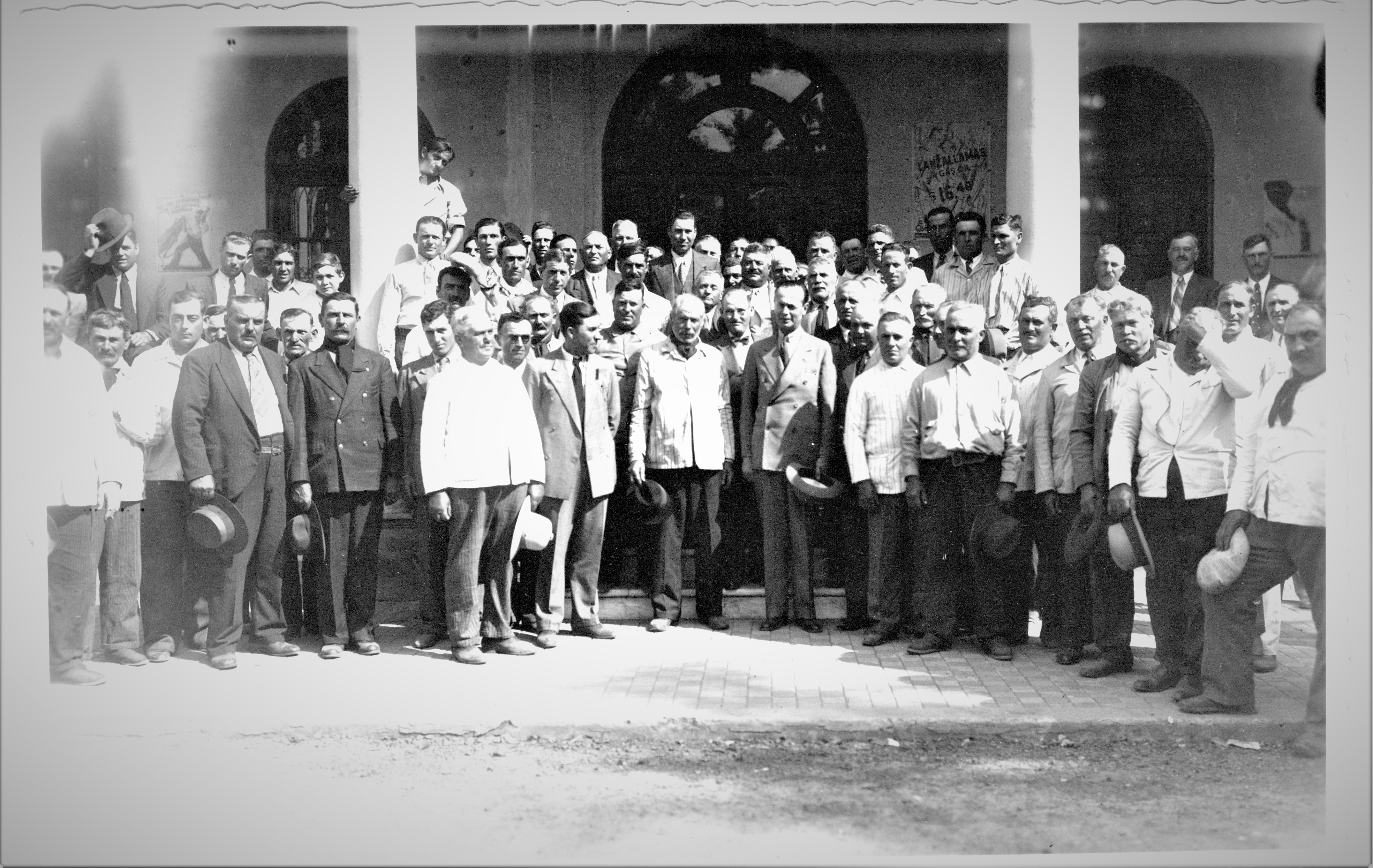 Todo el personal de la Escuela: obrero, administrativo, docente y directivo, en el atrio de la Escuela. Al centro, al fondo, la entrada al pasillo de la Administración, a su izquierda la ventana de la Administración y a su derecha la de Jefatura de Internado. En el reverso el sello BIBLIOTECA ESC. AGROTÉCNICA "LIBERTADOR GENERAL SAN MARTÍN" y el de la casa de fotografía con la fecha 29 de diciembre de 1937.