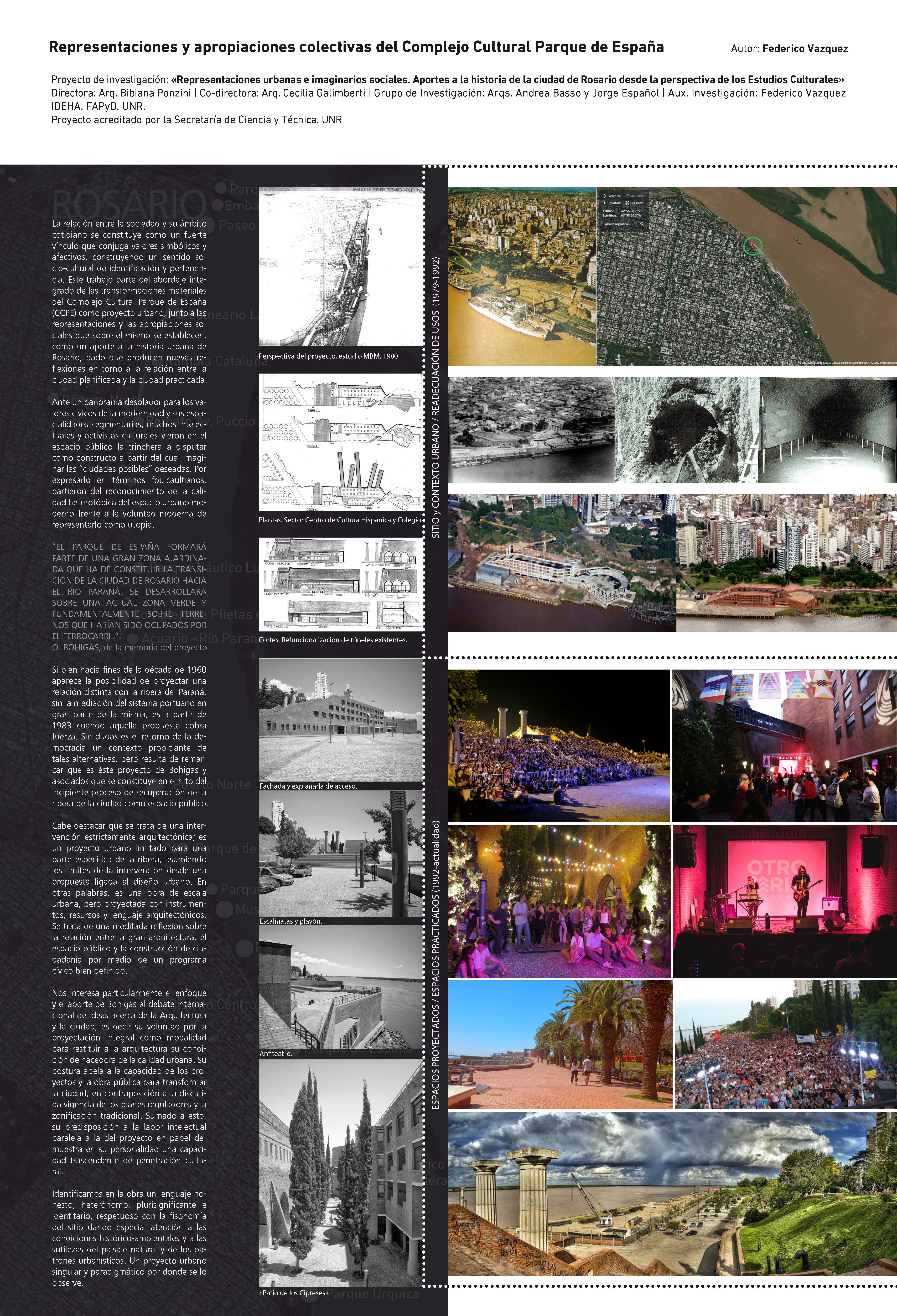 Este trabajo parte del abordaje integrado de las transformaciones materiales del Complejo Parque de España (CCPE) como proyecto urbano, junto a las representaciones y las apropiaciones sociales que sobre el mismo se establecen, como un aporte a la historia urbana de Rosario, dado que producen nuevas reflexiones en torno a la relación entre la ciudad planificada y la ciudad practicada.